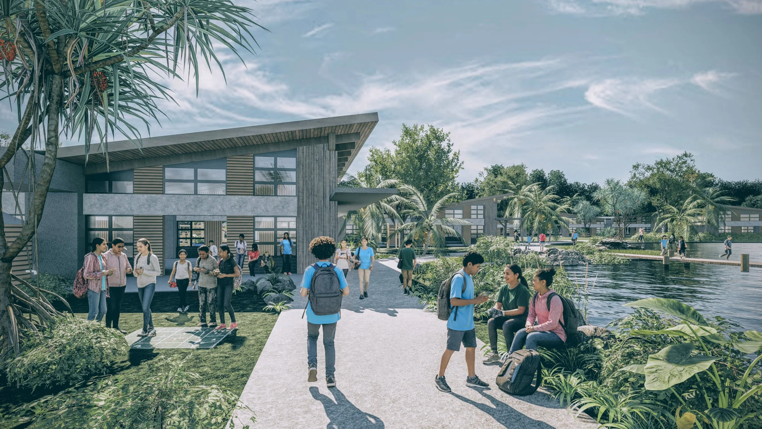 The Māhualauhīnano master plan translates a vision for a resilient Kīpuka in Keaukaha, home to Ka ʻUmeke Kāʻeo and Hui Hoʻoleimaluō, into a conceptual site design that supports education, cultural continuity, ʻāina stewardship, and climate resilience. Developed through community engagement, organizational priorities, and site research, the master plan incorporates facilities for 450 students with specialized spaces like a hālau, wet lab, and hale waʻa, while also serving as an emergency shelter with hurricane-protected areas, and renewable energy systems. the design emphasizes advancing Hawaiian language and knowledge, honoring Keaukaha’s heritage, improving resilience, fostering community and environmental connections, ensuring generational longevity, and leveraging innovative solutions.