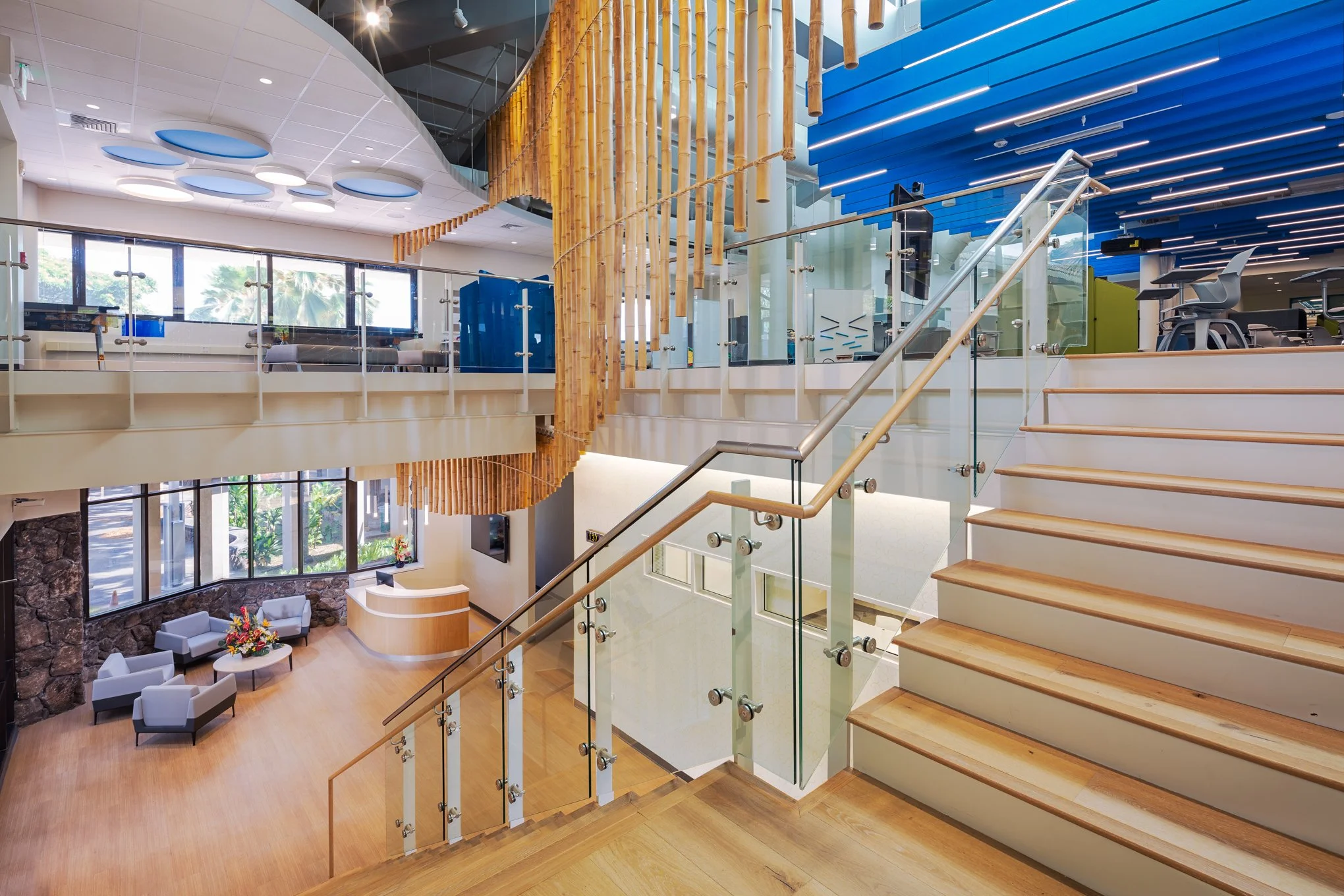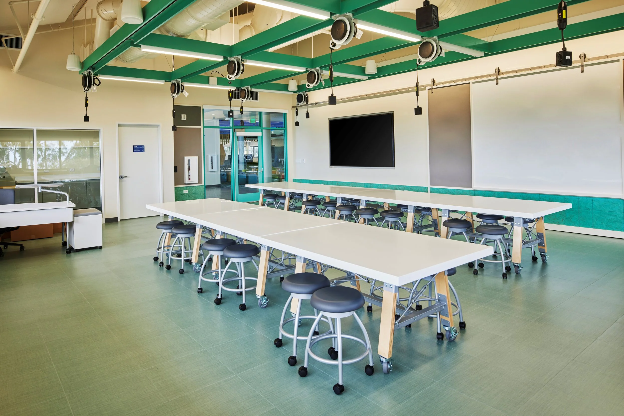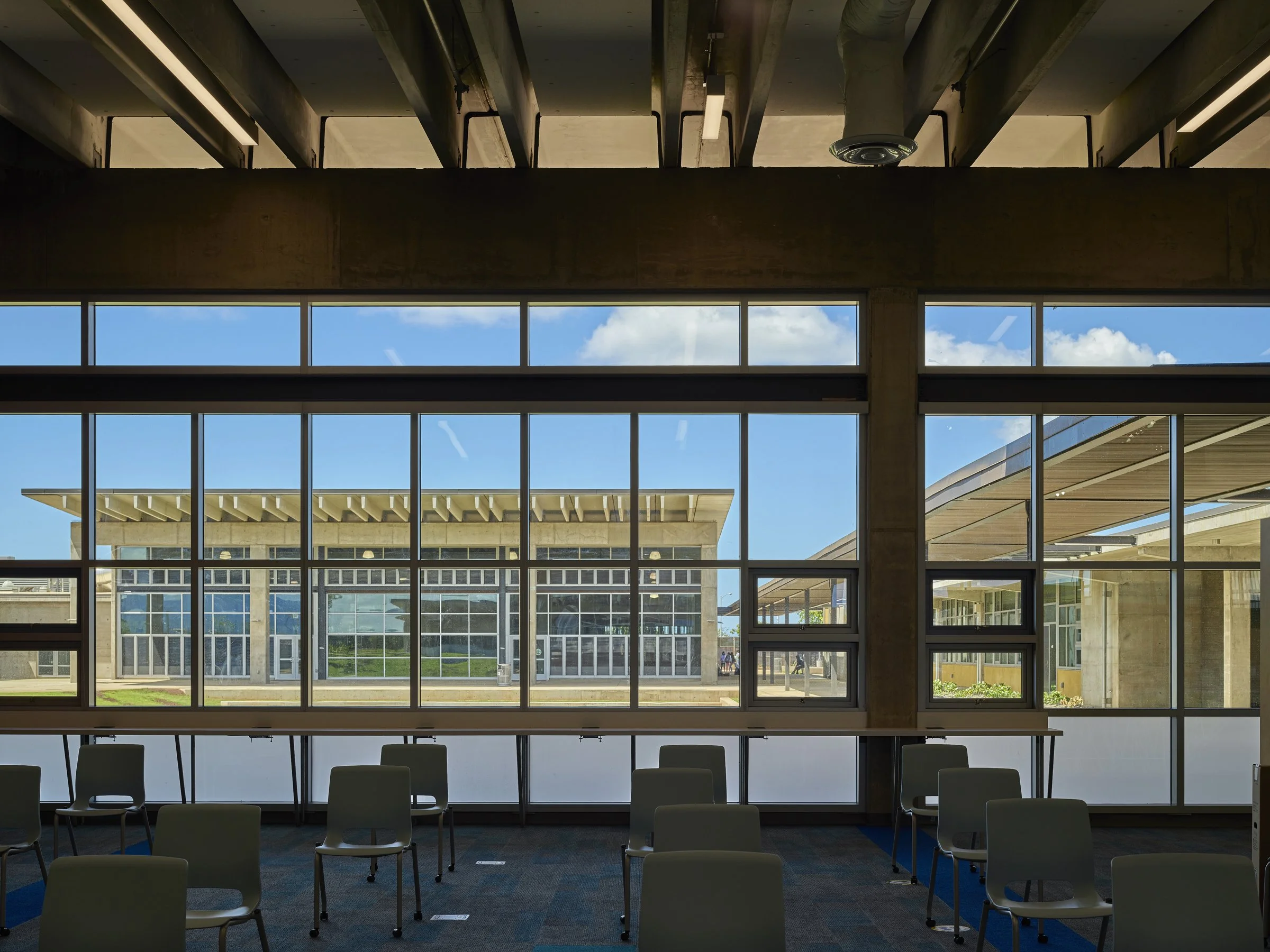 The Kekelaokalani Building has been renovated into a state-of-the-art Learning Center by Ferraro Choi. The second floor features offices, conference rooms, and staff support spaces, while the third floor houses the heart of the Learning Center with flexible teaching spaces, collaboration areas, an innovation lab, a maker space, and a media center.