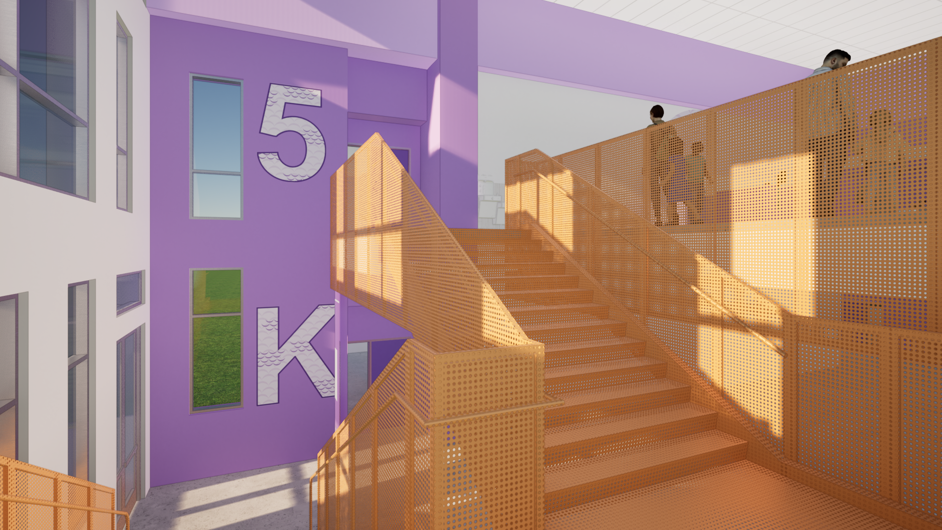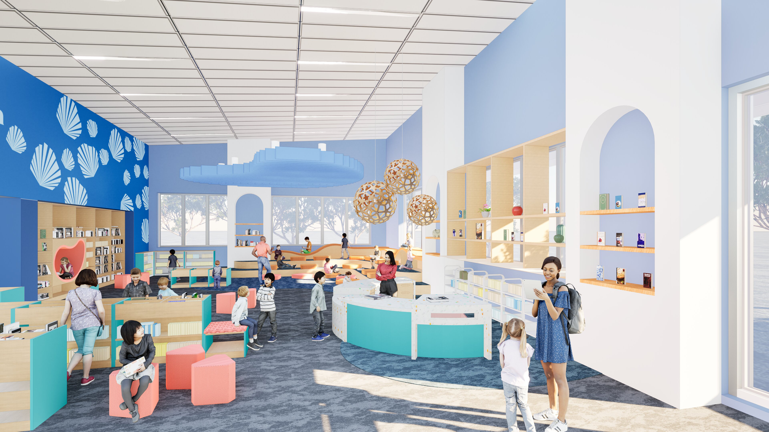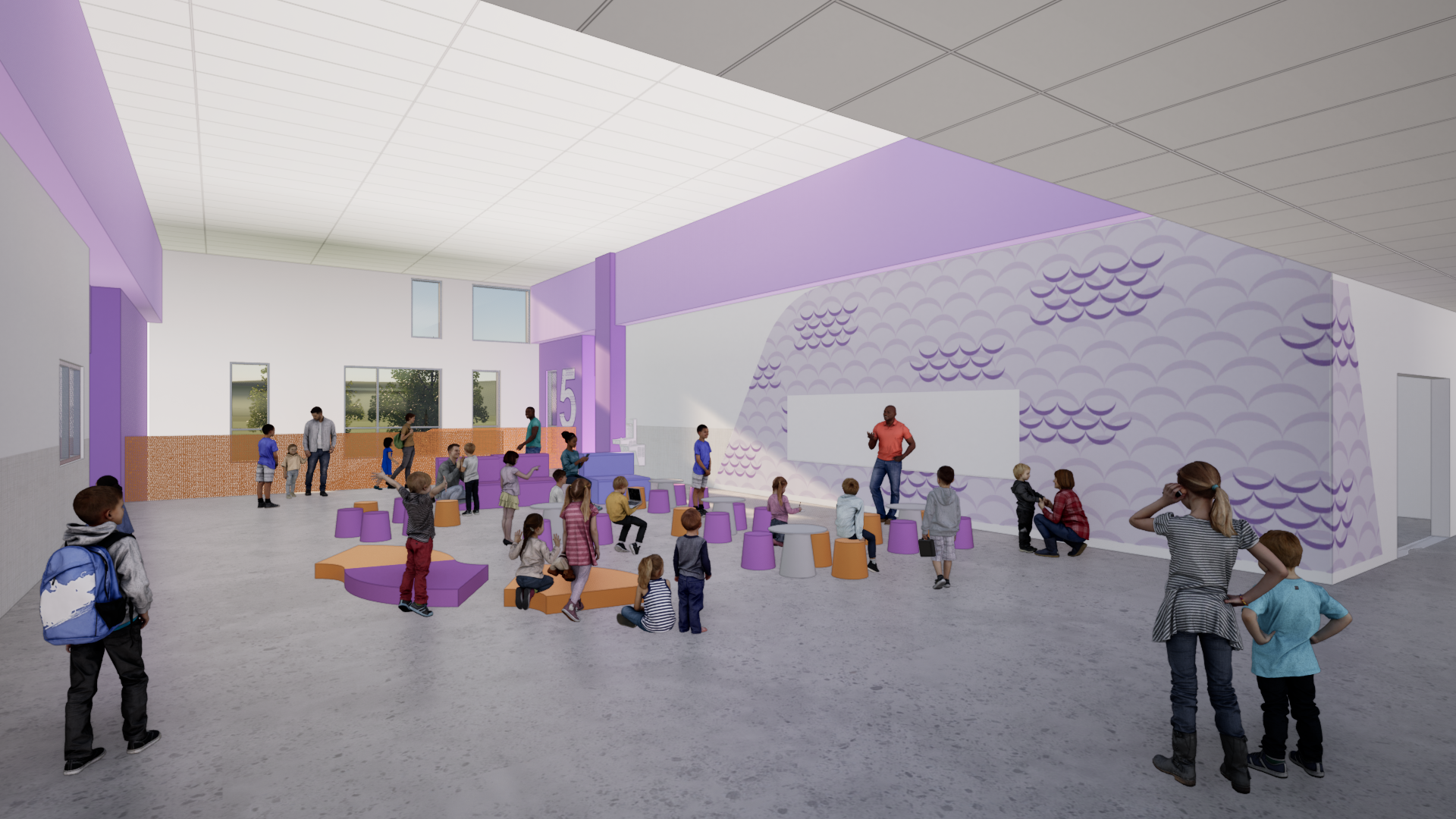 The school’s five buildings are arranged around a central park, featuring a performance lawn, playgrounds, native landscaping, a teaching garden, and outdoor learning spaces. Each building tells a story—developed through cultural research and expressed through thematic color palettes and custom graphics that reflect its location and purpose.