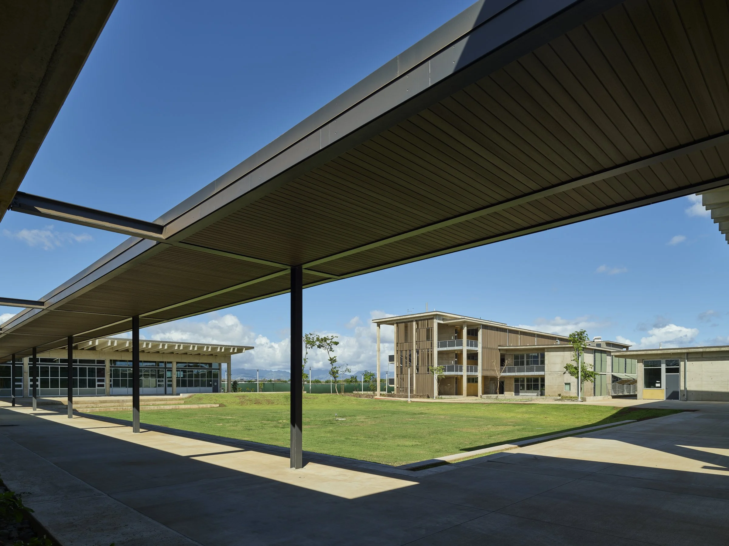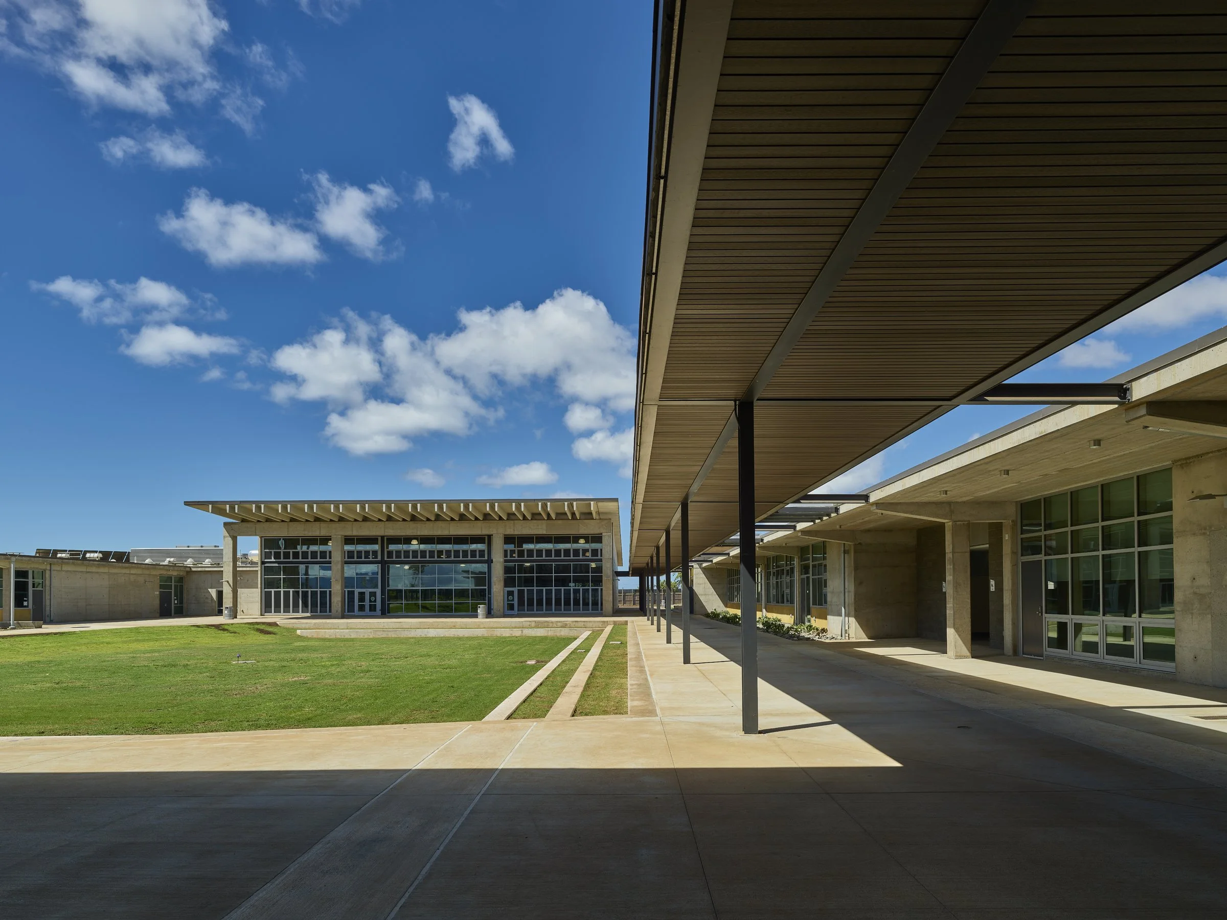 Sustainability is central to the design. The school targets LEED v4 Silver certification, with potential for Gold through renewable energy integration. Passive design strategies and high-efficiency mechanical systems reduce energy consumption, while daylighting and dedicated HVAC systems enhance comfort in every instructional space. The campus also encourages walking and biking from the surrounding Ho‘opili neighborhood.